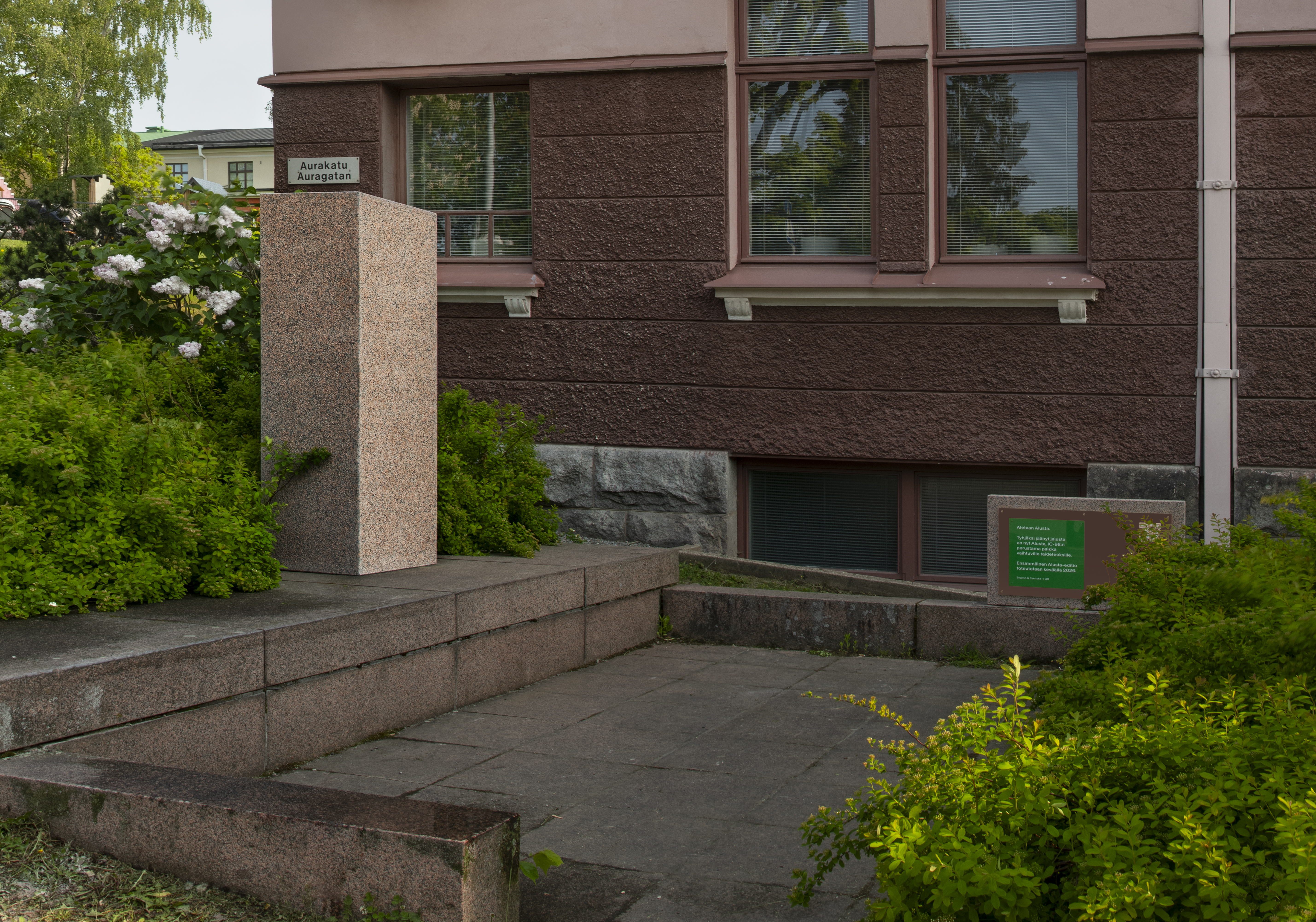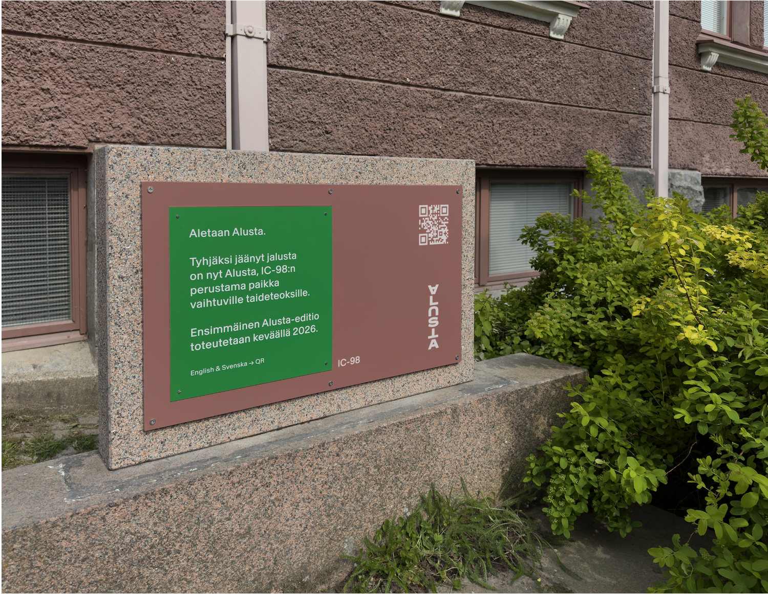 Aletaan Alusta, ehdottaa vihreäpohjainen kyltti Turun taidemuseon kupeessa Puolalanmäellä. Kyltin vieressä seisoo tyhjä, punaisesta graniitista tehty alusta. Aiemmin alustalla oli, vuodesta 1977, V.I. Leninin rintakuva, joka poistettiin vuonna 2022 Venäjän hyökätessä Ukrainaan. Nyt alusta itsessään muodostaa teoksen eli turkulaisen taiteilijapari IC-98:n Alusta (2025–) -intervention. Teos muodostuu sekä tyhjästä alustasta että sille toteutettavista, vaihtuvista taideteoksista, joista ensimmäinen toteutetaan alkuvuonna 2026. Teos muistuttaa, miten myös ele voi toimia teoksen materiaalina, ja miten poissaolo voi olla aktiivista[14], poliittista ja kysyvää.