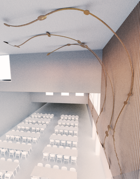 Keidas-teoskokonaisuus kasvaa rakennuksen arkkitehtuurista tuoden siihen oman kokonaisuutta kohottavan ja eri tavoin eri käyttäjille avautuvan tason. Teos on ruokalassa yllättävä, ja se luo monenlaisia eläviä ja muuttuvia varjoja tilaan.